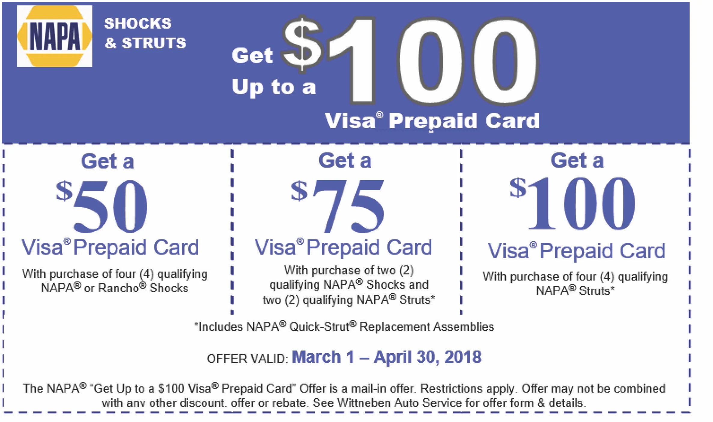 The NAPA Visa Prepaid Card is a mail-in offer. Restrictions apply. Offer may not be combined with any other discount, offer, or rebate.